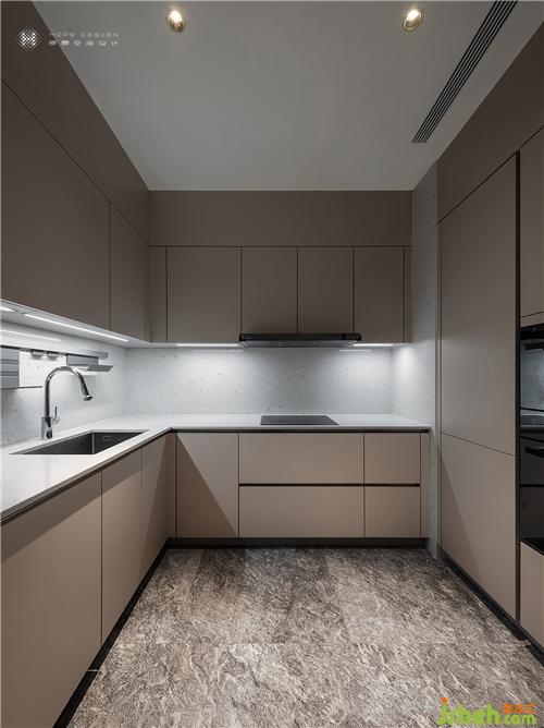 中間區(qū)域并未設(shè)置過多掛架,針對烹飪習(xí)慣制作靈巧的結(jié)構(gòu),足以應(yīng)對種類繁多的廚具,筒燈與隱藏式的燈帶設(shè)計配合,滿足烹飪時的照明需求更顯干凈美觀。