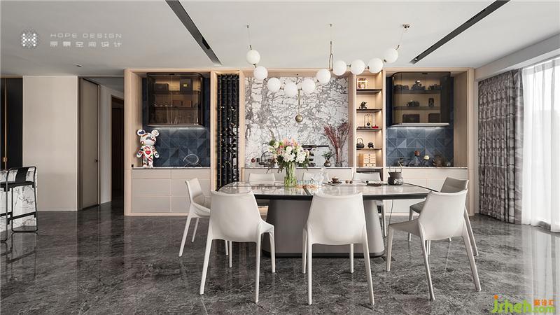用餐區(qū)域精心挑選輕柔色,與珍珠項鏈般白色吊燈搭配呈現(xiàn)出和諧成熟的效果,混合著柔紗透過的日光浴讓整體更加溫馨明亮。