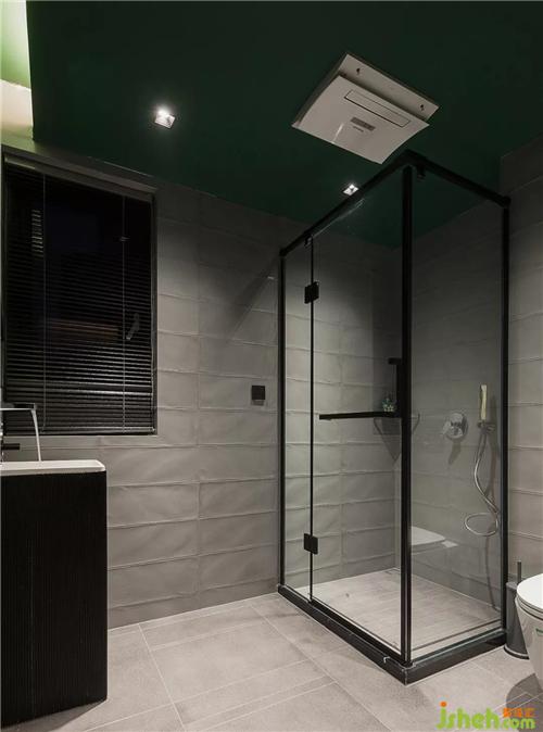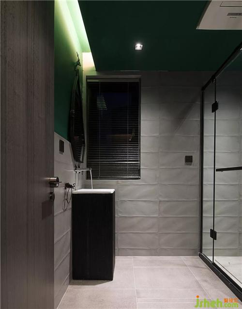 高貴典雅的墨綠色墻面和頂棚穿插著混搭淺灰色巧克力瓷磚,讓色彩自在游弋,煥然新生。