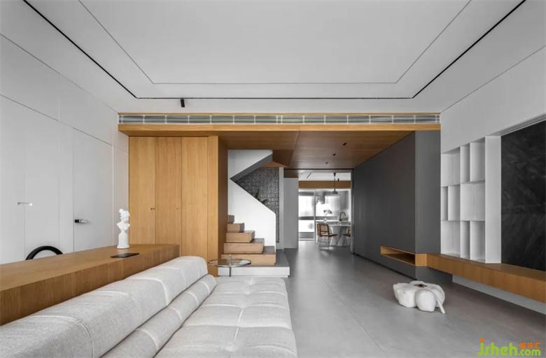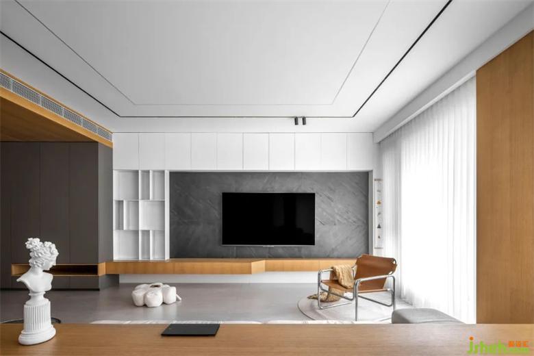 整個(gè)客廳空間采用了無(wú)主燈設(shè)計(jì),兩條貫穿客餐廳裝修設(shè)計(jì)的軌道燈就是主要的照明方式??蛷d處輔以筒燈點(diǎn)綴,增加局部區(qū)域的照明度。吧臺(tái)的設(shè)置,在空裝修設(shè)計(jì)間兼具多種功能??蛷d兩側(cè)的隱形壁櫥設(shè)計(jì),也使得儲(chǔ)存功能大大增加,在兼具美觀(guān)的同時(shí)包容生活的雜糅。