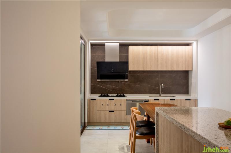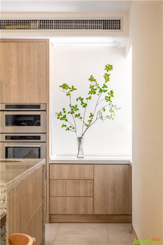 我們希望餐廚空間簡潔利落,讓家庭廚師日常操作順暢無阻點,即使是臺面石材與磚之間也平和流暢,干凈整潔的廚房是主人善意純粹的人格物化。