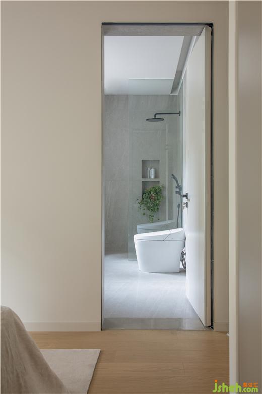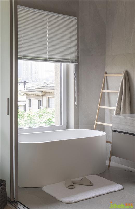 衛(wèi)生間冷灰瓷磚、大理石臺盆、柔軟地毯,