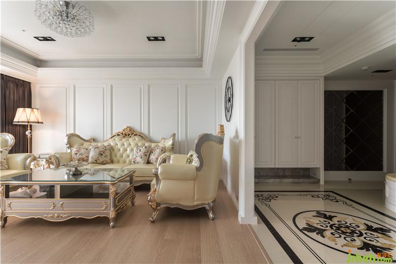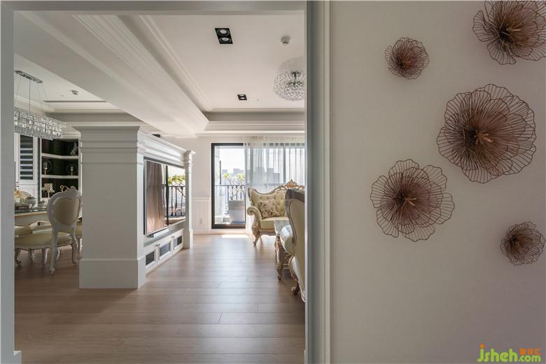 此案裝修公司將新科技智能家電融入新古典的空間,明亮純凈的玄關空間,運用優(yōu)雅花瓣紋路大理石、菱格灰鏡、歐式門片及牡丹墻飾,創(chuàng)造出以花開富貴為主題之典雅迎賓的場域氛圍,整體空間以訂制歐式家具為主角,進而以新古典歐式純白風格來襯托