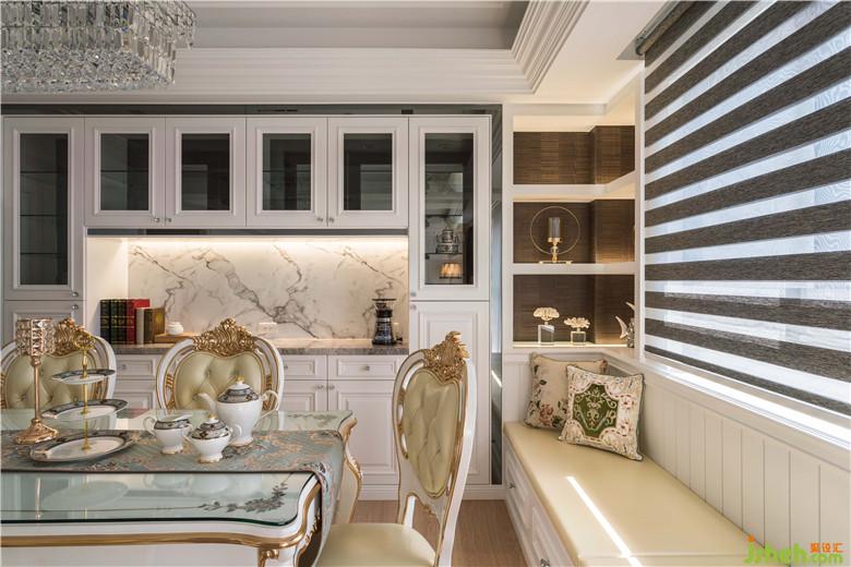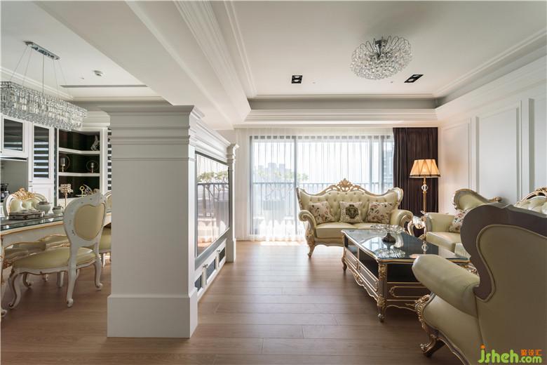 客廳電視墻以潔白優(yōu)雅的壁爐呈現(xiàn),與純白層次的線條天花及歐式沙發(fā)背墻相呼應,裝修公司以壁爐作為客廳和餐桌之區(qū)隔,歐式壁爐由設計師依線條比例繪圖設計,呈現(xiàn)完美線條襯托屋主氣質