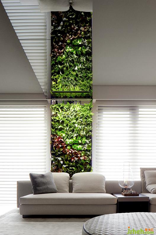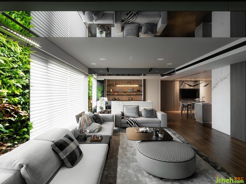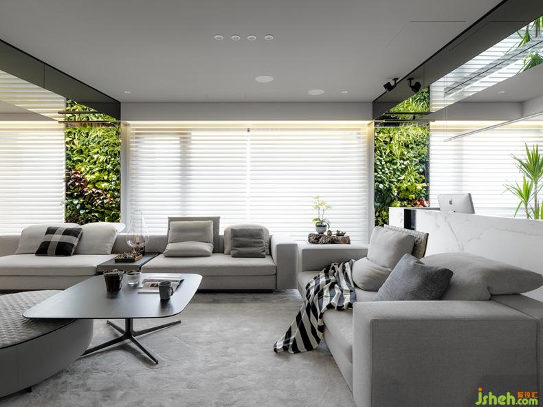 首先在客廳窗與窗間的結(jié)構(gòu)柱位置,大膽導入室內(nèi)植生墻設計,結(jié)合專利的滴灌系統(tǒng)與照明,帶動居宅內(nèi)全時段進行的活氧光合作用,而在兩列縱向的植生墻上方天頂,依等寬設置兩座為橫樑的水平向鏡盒,借鏡面倒影創(chuàng)造全視角的室內(nèi)花園意象,目光所至,一天的疲勞跟著煙消云散。