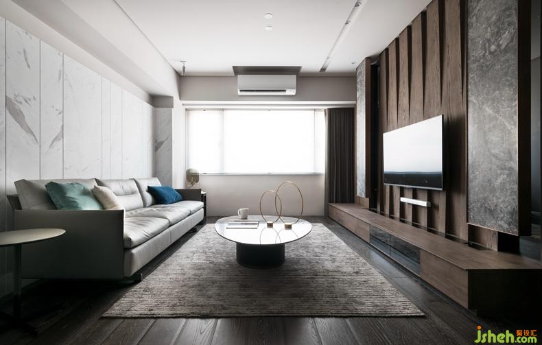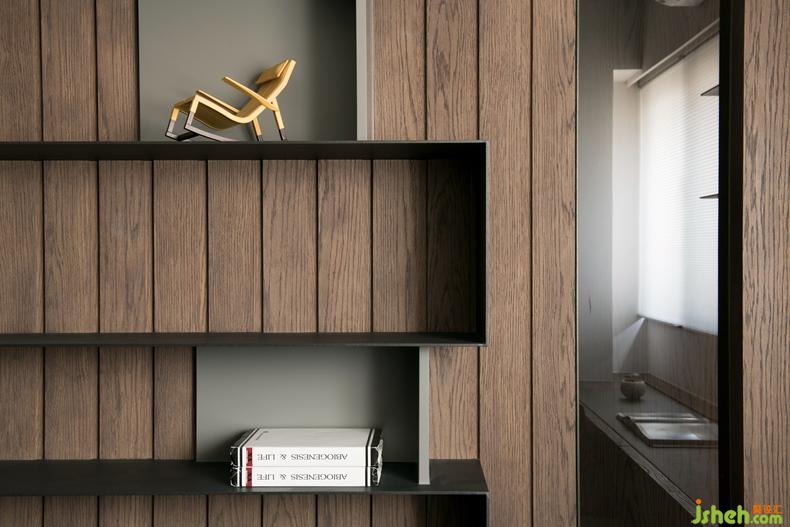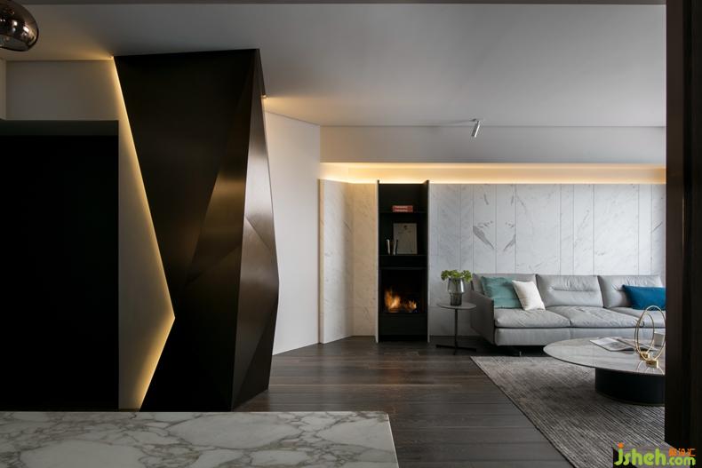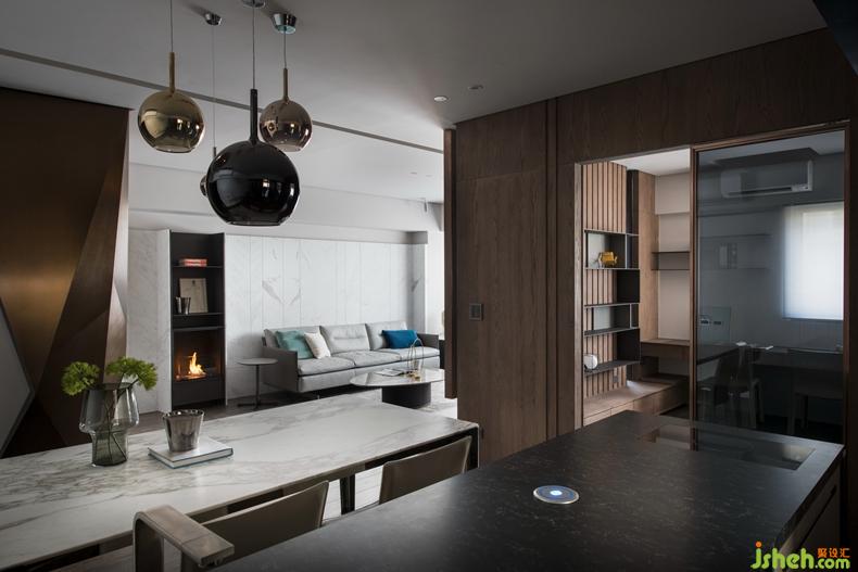 公領(lǐng)域天花板的平整、干凈,有效拉升仰角視野,客廳電視墻與沙發(fā)背墻的線性解構(gòu)則各有表述,首先大量鋼刷木料施作的電視墻,同時也是客廳、書房的共用介質(zhì),正立面導入X型立體剖面設(shè)計,抽象筆觸創(chuàng)造背光陰影下不同角度里的驚喜,兩側(cè)各懸掛一座鑲嵌薄巖板的鐵件框飾,不只為電視墻構(gòu)圖增加層次,更是隔間前移概念的創(chuàng)意演出,而透過鐵件框下的灰玻還能看見墻后書房區(qū)若隱若現(xiàn)的景致。選用啞光大理石直列分切、轉(zhuǎn)折、錯拼而成的沙發(fā)背墻,隨興織就的天然紋理,遠比刻意對花來得迷人,而在背光掩映與刻意不貼到頂?shù)氖址ㄏ?,一派動人的純凈與輕盈自然涌現(xiàn),左側(cè)另嵌入一座電壁爐,賦予空間恰到好處的個性與溫度。