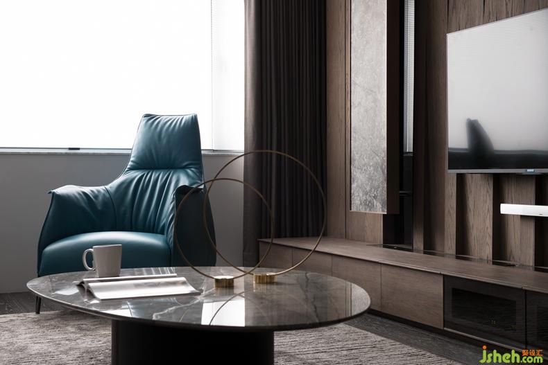 The flat and clean ceilingin the public area effectively raises the view from theangle of elevation. The linear deconstruction oftheTV wall and sofa back wallinthe living room is expressed differently. First, the TV wall, made of a large amount of steel-brushed wood, isshared between the living room and the study room. AnX-shaped three-dimensionalprofile design has been introduced into the front elevation. Theabstract strokes create surprisesfrom different angles under the backlit shadows. Apiece ofdecorativeiron frame embedded withthinstoneslateshas been hungon each side, whichnot only adds layers to the composition of the TV wall but also creatively presents the concept of movingthecompartment forward. The gray glass under the iron frameallowsfora view of the gleaming studyroomarea behind the wall. Thesofa back wall, madeof straight slitting, twisting, andrandomsplicing ofmatte marble, shows anatural texture thatis far more charming than can be found with deliberately createdpatterns. Through the setting off by thebacklight and the intentional avoidance of reaching the ceiling,atouchingpurity andgrace naturallyarises. An electric fireplace is embedded on the left side to give the space just the right personality and temperature.