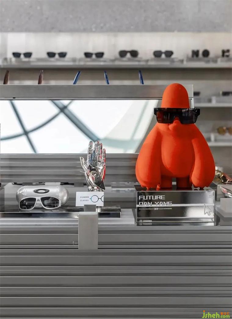 在接待處最先向我們招手的是友愛科技金貓,它是探索未來生活的新形象。裝修設(shè)計銀色的服飾,閃爍光芒的紅色眼鏡,充滿了極致的未來科技感。棱鏡質(zhì)感的服飾和閃耀的視光眼鏡,都象征著科技金貓對未來生活的極致追求。