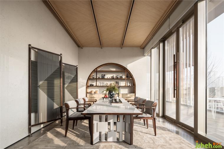 咖啡與茶是人們?nèi)粘I钪蓄H為重要的部分?!俺圆枞ァ薄帮嫴柘取钡木W(wǎng)絡(luò)用語(yǔ)里蘊(yùn)藏著古人對(duì)茶的鐘情之意。茶水雅淡,因此在器物的選擇上不宜過(guò)份鮮妍,光是為了傳遞茶之美,飲茶之閑適淡然,售樓處設(shè)計(jì)就必須在設(shè)計(jì)中獨(dú)具幾份心思與創(chuàng)新。為了彰顯“空”的精神,特意選擇具有鏤空特質(zhì)的屏風(fēng)與茶桌,傳遞出茶室的空間意蘊(yùn)。