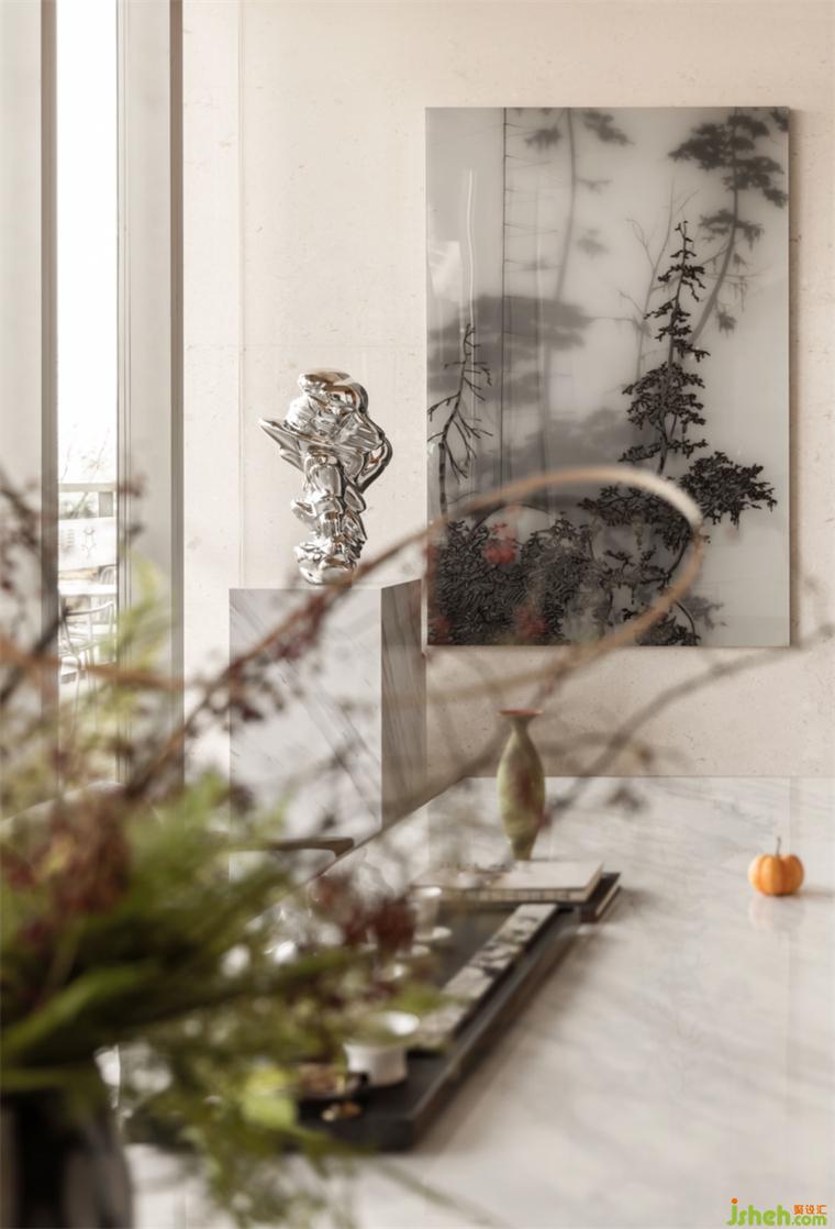 會(huì)議室的藍(lán)色躍入眼簾,為空間帶來(lái)了生動(dòng)性,雅致花器與質(zhì)樸小鹿擺件,售樓處設(shè)計(jì)簡(jiǎn)單的器物便為空間增添了藝術(shù)性的表達(dá)。空間器物與陳設(shè)滿(mǎn)足會(huì)議交談實(shí)際需要,在實(shí)現(xiàn)空間功能性建構(gòu)的同時(shí),不失卻人與人之間交談的溫度。