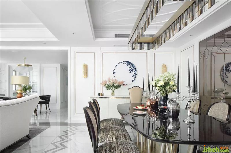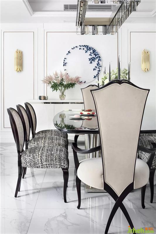 開敞明亮的餐廳以餐桌椅纖細(xì)優(yōu)雅的線條,中和了空間的莊重感,使之不過(guò)于沉滯,多了幾絲溫軟清逸的氣息。天花板的魚形紋與餐椅相呼應(yīng),婉曲相疊間,與地上的水波紋交織在一起,靈動(dòng)多姿。