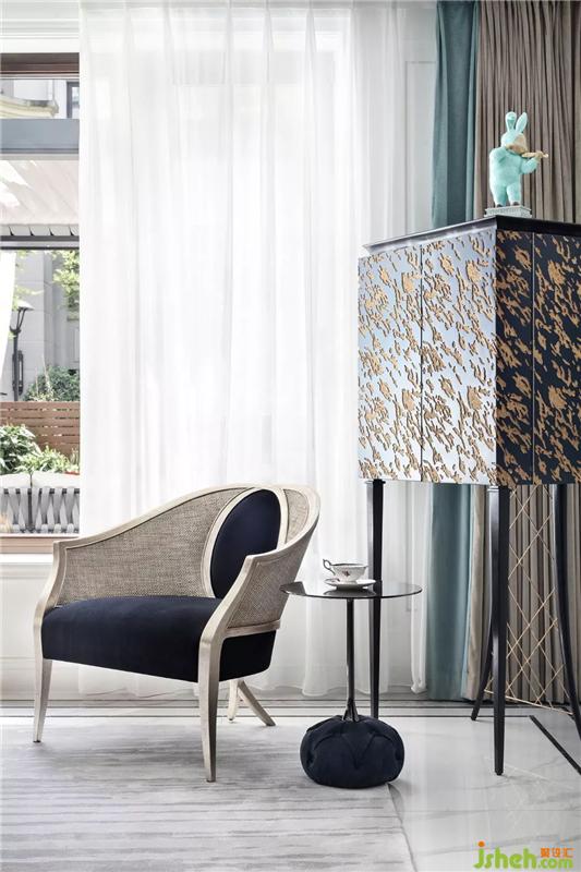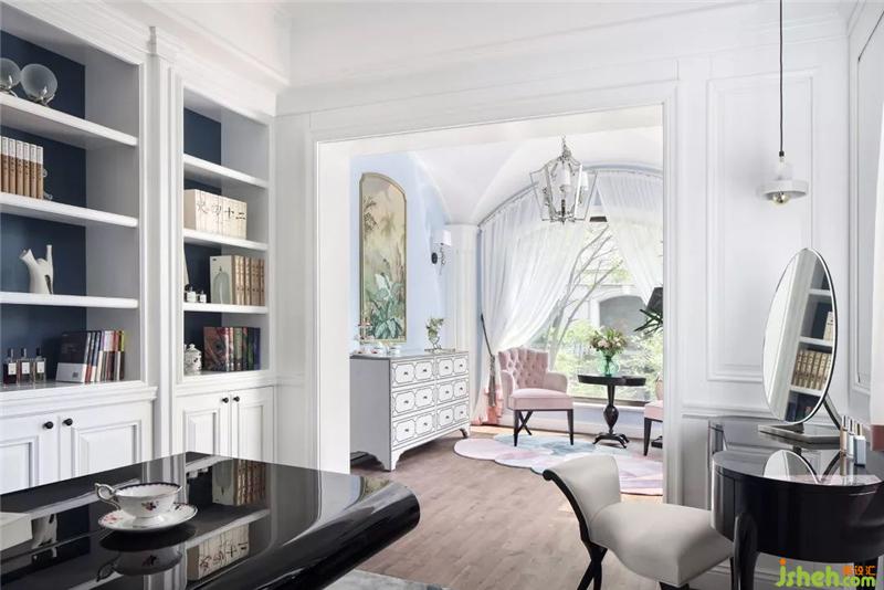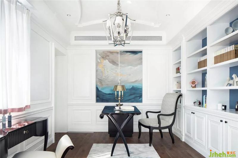 書房與英式茶室連為一體,貫通的空間不僅引入了更多的自然光入室,更將休閑與私密空間結(jié)合在一起,讓主人可在工作與休閑之間適意切換。工作之余,踱步到茶室,置身于典雅精致的英式家具中,在一股清新的田園風(fēng)中,眺望欣賞窗外的美景。
