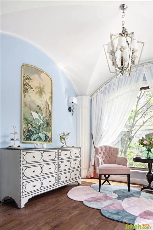 主臥,色彩浪漫恬淡,清新可人,營造出寧謐自然的氛圍,溫柔熨帖,又慵懶隨性,墻面上垂瀉下來的紫藤蘿瀑布,像一個浪漫甜蜜的紫色夢境。
