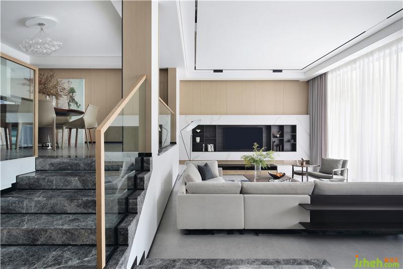 為了兼顧負(fù)一樓下沉空間的高度,我們在一樓休閑廳的書柜處做了整體抬高的平臺,使之與負(fù)一樓的樓梯間一起,形成更為錯落有致的空間層次感。