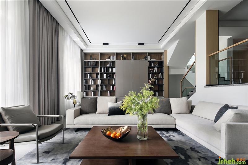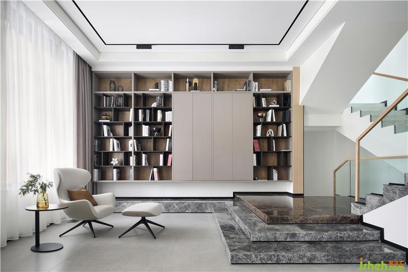 休閑廳為客廳的補(bǔ)充空間,位于樓梯平臺(tái)旁,沉穩(wěn)質(zhì)感的書(shū)柜鋪滿整面墻,如源頭活水般浸潤(rùn)著整個(gè)空間,正是“書(shū)卷多情似故人,晨昏憂樂(lè)每相親”。