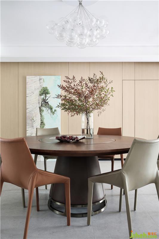 原木材質(zhì)的家具,油畫(huà)中遒勁的峭壁蒼松,餐桌上的疏影橫斜的瓶盞,自然質(zhì)樸,在濃淡相宜的雅致中,愈增清新與活力。