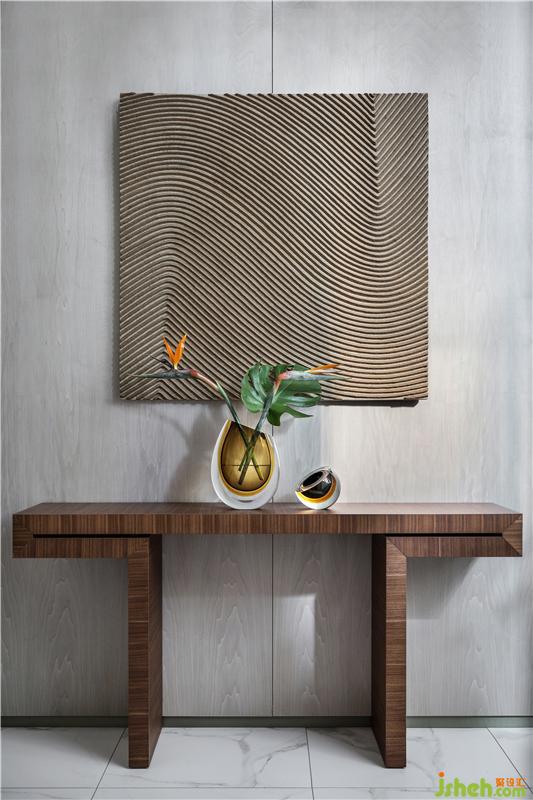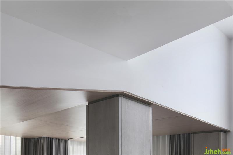在本項(xiàng)目的空間中,直角折線將冷暖融會(huì)平衡,譜寫出和諧的旋律,使空間形成內(nèi)在統(tǒng)一的渾融秩序。鈍角折線則試圖沖破發(fā)出強(qiáng)音,卻終因內(nèi)質(zhì)的柔和而趨于悠揚(yáng),打破空間和諧秩序的同時(shí),讓空間變得富于潤度。當(dāng)今時(shí)代“擬物”審美的催生、極簡(jiǎn)風(fēng)的盛行都離不開人們重新審視自然的眼光。返璞歸真、回到物本身……都不僅僅再是一個(gè)口號(hào),而是空間迫切需要灌注的養(yǎng)分??臻g本身就有著自己的呼吸開闔,一呼一吸,無拘無束,自然而然。 理性嚴(yán)謹(jǐn)?shù)目蛻粝矚g天然的木質(zhì)材質(zhì),沒有現(xiàn)代的奢華感,充滿溫暖。設(shè)計(jì)師因此在空間中運(yùn)用了大量的原木元素:木質(zhì)屏風(fēng)、沙發(fā)底座、臺(tái)燈底座、木質(zhì)樓梯、木質(zhì)版畫、木質(zhì)方幾……無不流露出濃郁的自然雅韻。