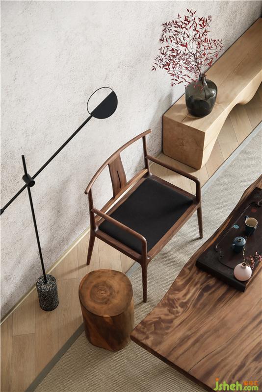 質(zhì)樸敦厚的木質(zhì)矮凳,體現(xiàn)著曲線的“豐潤”之美,盈缺有度,它將空間高度降低,進(jìn)一步營造出茶室視野的開闊。茶桌上的木紋漾開一道道曲線,肌理細(xì)膩?zhàn)匀弧2枰螆A潤的扶手憑借良好的觸感讓人格外心安。 “心遠(yuǎn)地自偏”的清凈茶室,樸實(shí)無華,卻在喧鬧的現(xiàn)代城市生活中為人提供了一處慰藉心靈的“桃源”。