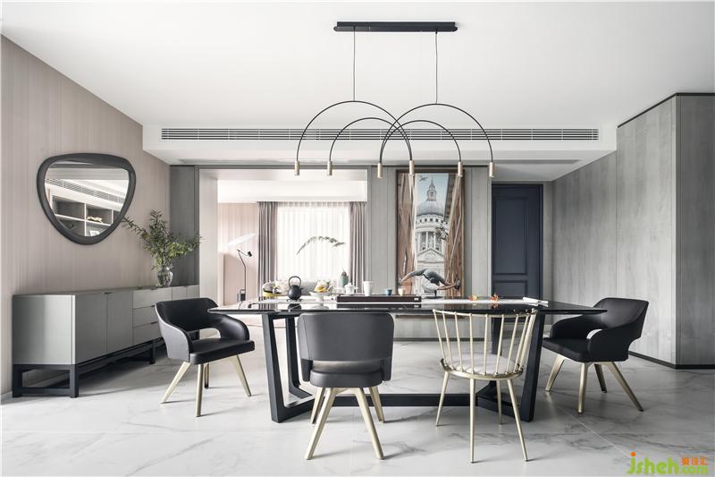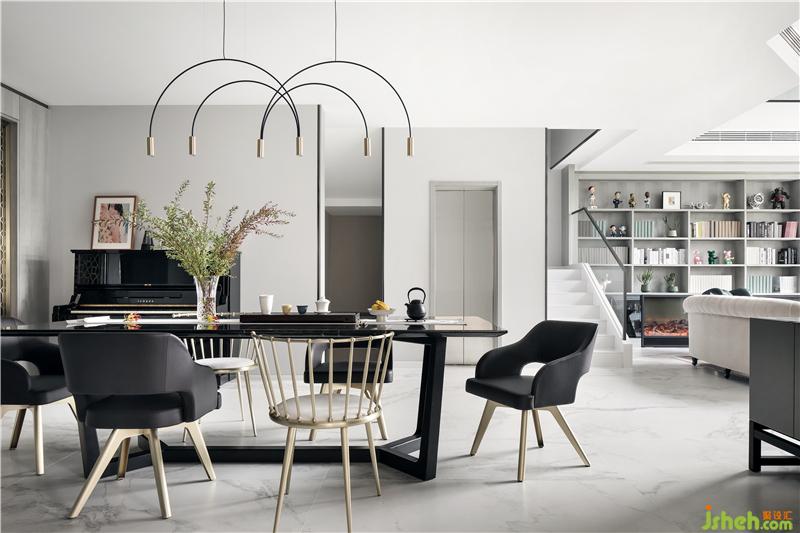 開(kāi)放式茶室,與客廳連通,選用質(zhì)感十足的黑金作為主色調(diào),營(yíng)造一方愜意的品茗修心之地。王念東的畫(huà)作《圣殿前的跨越》,在色系上與整個(gè)空間相呼應(yīng),畫(huà)面的動(dòng)感使空間的韻律別具一格。