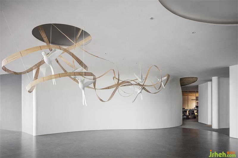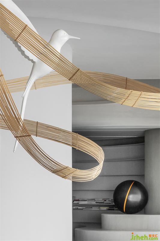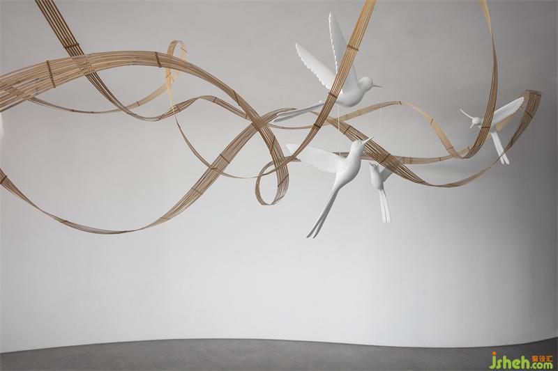 輕盈的竹編描繪出柔美的曲線,與輕快奮飛的飛鳥,在白色墻幕的原始肌理之下,空寂而純粹,不著一物,傍無所依,卻詩韻畢現(xiàn)。