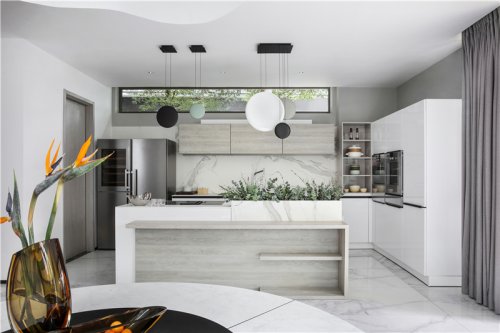 不同于傳統(tǒng)辦公空間將餐廚空間作為次要空間的一貫布局,新辦公區(qū)設(shè)計借吸納了西方餐廚空間的社交開放文化,餐廚空間同樣視野極佳,餐桌與島臺相連,長達(dá)7米,使得空間的縱深感進(jìn)一步延伸,顯得更為大氣朗闊,除了作為日常的項目方案溝通會議區(qū)外,這里還可作為休閑社交的沙龍分享區(qū)、私宴宴請區(qū)。