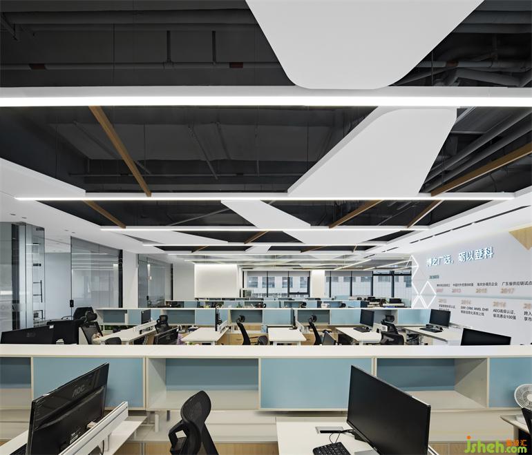 ?靈活的工作環(huán)境可以讓員工隨時隨地有工作歸屬感。開放式的辦公區(qū)域有天然的秩序感。設(shè)計在天花做法中穿插不規(guī)則梯形板,豐富空間。提高空間使用效率和區(qū)域效益。