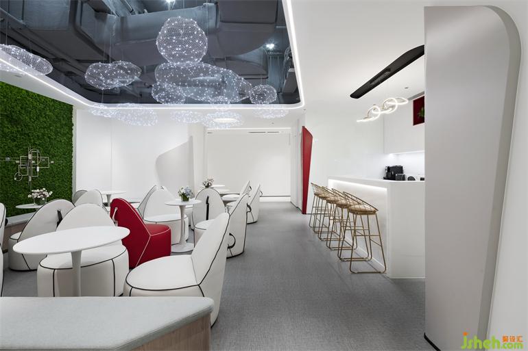 公共通道大面積的使用白色,潔凈時尚,充滿未來感。局部的圓形造型呼應(yīng)著公共空間的造型要素。