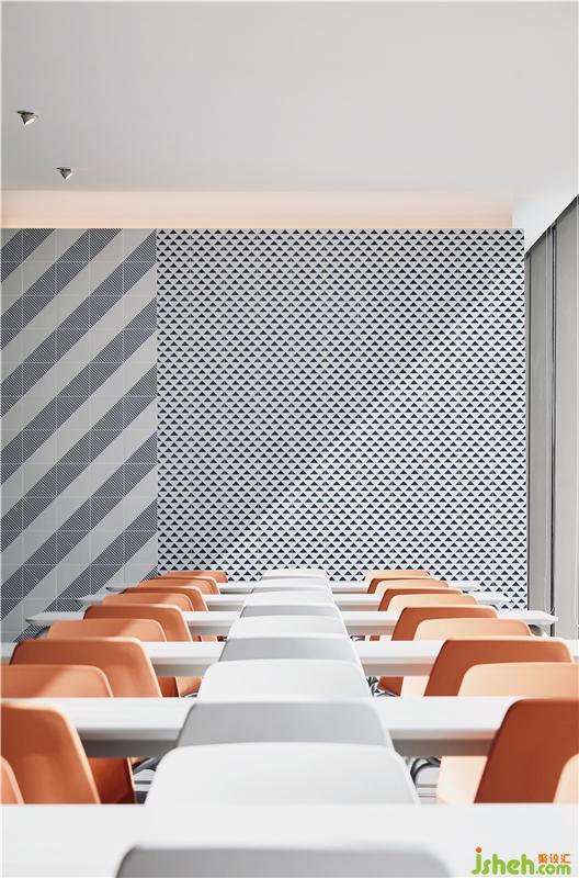 躍動的色彩搭配不同肌理的幾何圖案取代了中規(guī)中矩的灰白色系,大膽的對比挑逗人們的視覺神經(jīng),創(chuàng)造了明亮活潑、讓人眼前一亮的視覺焦點(diǎn),成功為空間減噪。 餐廳設(shè)計(jì)