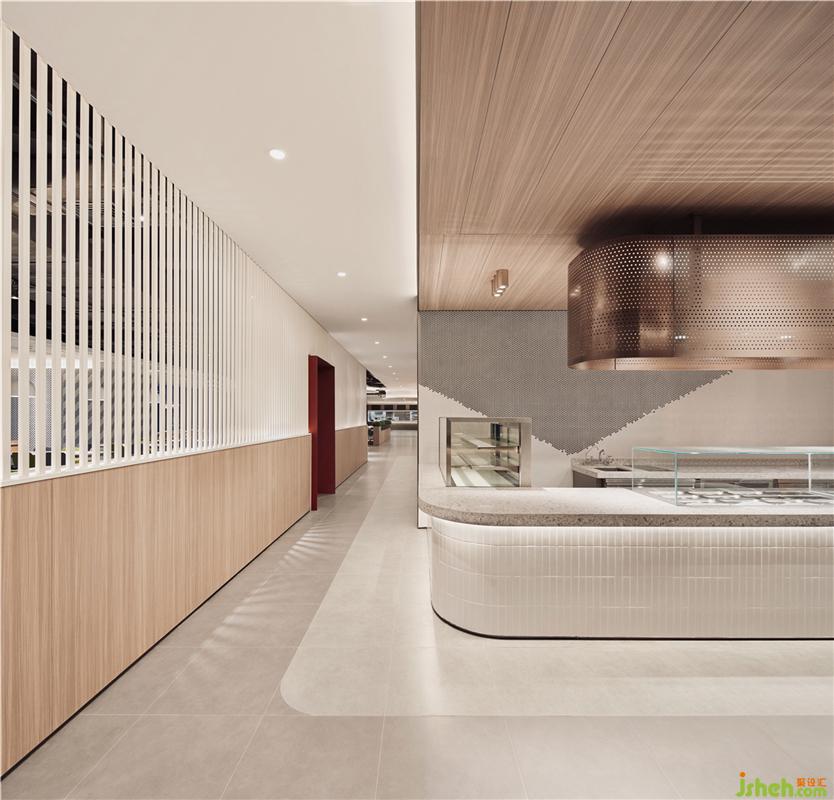 環(huán)形島整齊的門頭設(shè)計(jì)將不同菜系的美食串聯(lián),射燈、壁燈與燈帶的漫反射燈光讓不同的食材在這個(gè)環(huán)境中發(fā)揮出獨(dú)特的味覺屬性?!坝行蚨煌保巧钲谶@座城市開放與包容的屬性。