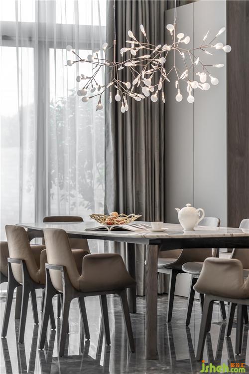 餐桌選用poltrona frau的NABUCCO系列,搭配Poliform咖色皮餐桌凳和Moooi聚酯材質(zhì)的藝術(shù)燈具,讓用餐空間舒適且富有質(zhì)感。