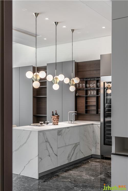 格調(diào)的考量不僅是表面所呈現(xiàn),更要關(guān)注生活化細(xì)節(jié)的處理。精心考量的紅酒架與折線臺(tái)面呈現(xiàn)一種貼心的比例契合,墻面嵌入式櫥柜有大量收納空間儲(chǔ)存廚具。