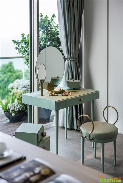 梳妝臺(tái)則選擇了Mashion Dada品牌,水曲柳和拉絲不銹鋼材質(zhì)相結(jié)合,清新柔和的綠色盡情展現(xiàn)女性氣質(zhì),兩個(gè)并列而交錯(cuò)的抽屜堆疊,別出新意的幾何造型,可愛而優(yōu)雅香港別墅裝飾。