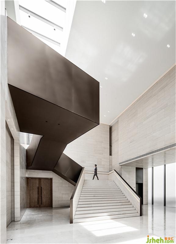 我們延續(xù)建筑“雕琢而現(xiàn)”的手法,利用大塊面強(qiáng)調(diào)出重點(diǎn)空間,將室外純凈的形體關(guān)系延續(xù)至室內(nèi),流轉(zhuǎn)的動(dòng)線讓場(chǎng)所更加豐富?,F(xiàn)代的建筑語(yǔ)匯構(gòu)建了空間通透、自然的格調(diào)。在高達(dá)10米的神圣尺度中,雕塑感極強(qiáng)的室內(nèi)樓梯成為空間中震撼的藝術(shù)裝置。樓梯貫穿起兩層,成為嶺南歷史走向現(xiàn)代文明的轉(zhuǎn)換通道。設(shè)計(jì)結(jié)合歷史元素和現(xiàn)代理念,完美詮釋了城市的發(fā)展與人類的精神訴求。
