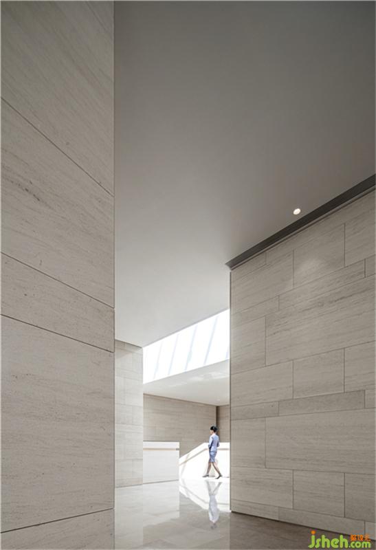 光影以極強(qiáng)的序列感,奏響起空間的前奏。自高處而下的光線使得墻面上的藝術(shù)品像漂浮于空中。自然光線透過(guò)天窗和結(jié)構(gòu)梁,空間中的墻和地板仿佛瞬間消融,為展示區(qū)留下了完美而純凈的背景。