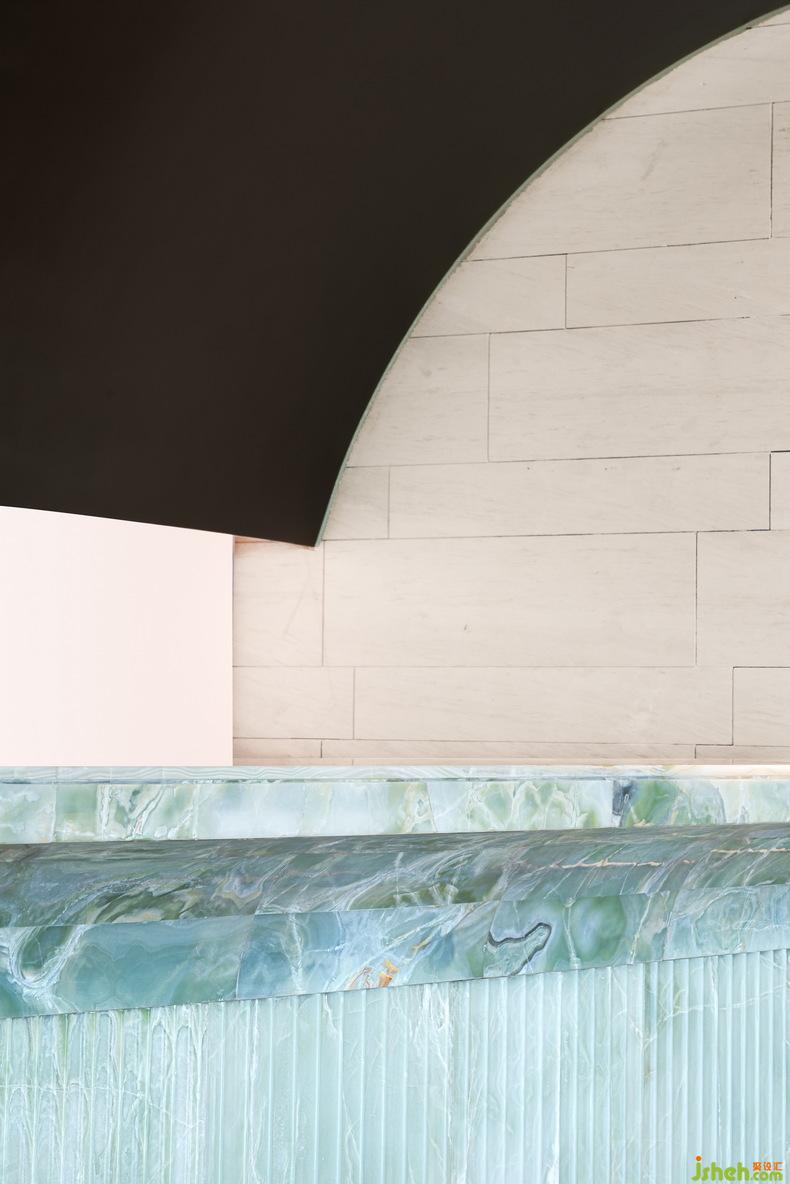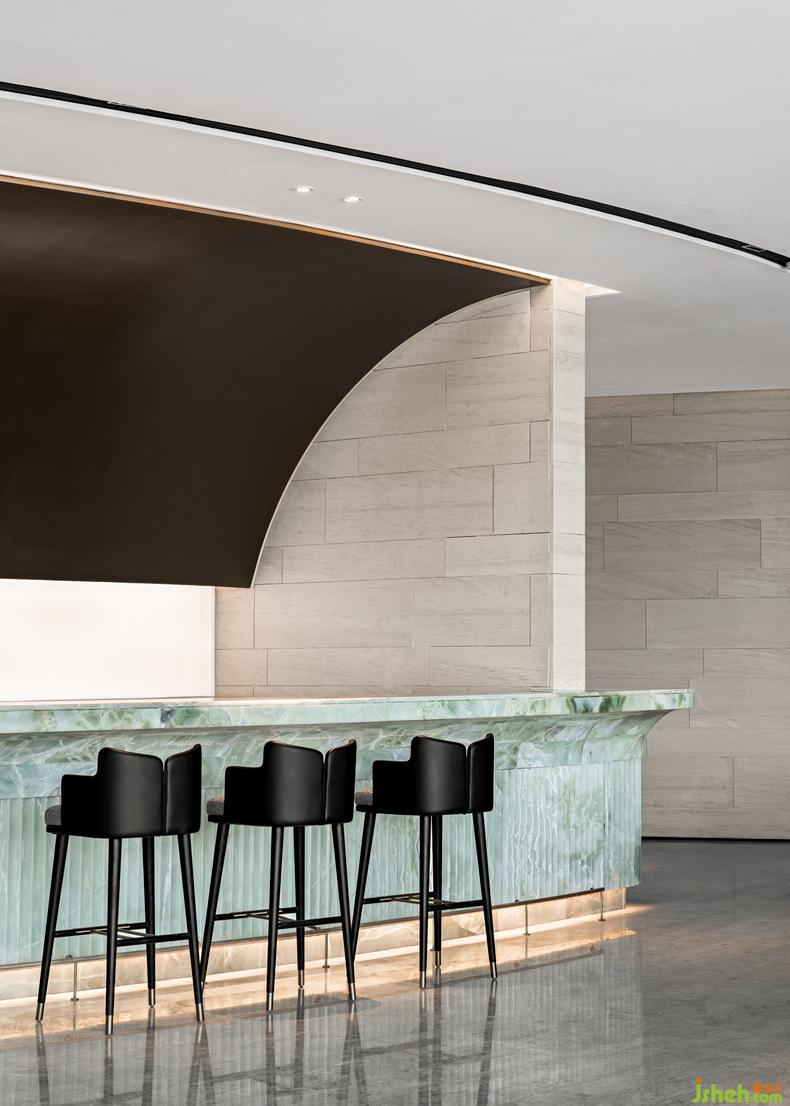 為了提升觀海的體驗,售樓處設(shè)計師在靠近連續(xù)落地窗的二層上空,開設(shè)了窄窄的條狀天窗。兩層通高的“花園式長廊”邀請自由的自然陽光,如鋼琴鍵般在冷暖相宜的理石墻面和地面上彈奏。室內(nèi)設(shè)計師帶有復(fù)古情調(diào)的海邊“空中清吧”詩意盎然,精致的金屬吧臺曲面背景與流線型前臺相呼應(yīng),也與華麗的奢侈品級青色玉石共同形成“享受時光流逝”的氛圍。