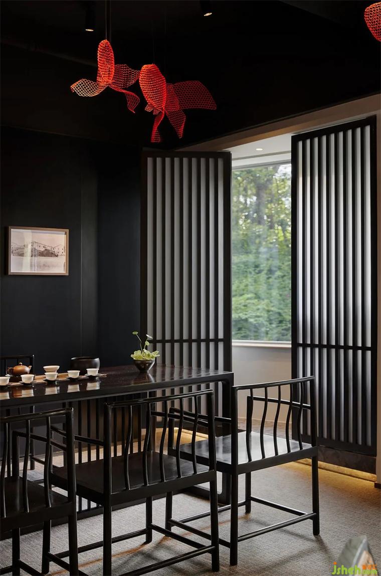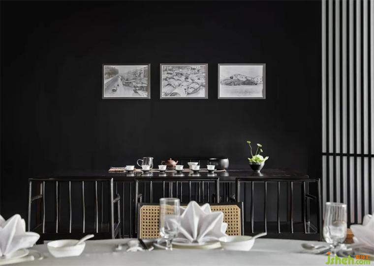 長凳置于茶室一角,瓷器獨有的內(nèi)涵。餐廳設(shè)計嶺南舊照的氣息軟化空間質(zhì)感,百年的傳統(tǒng)記憶被重新呈現(xiàn)。
