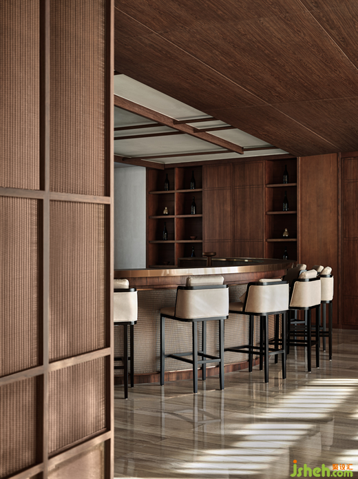 覆土建筑與自然融為一體,玻璃材質(zhì)倒映出湖面,波光粼粼。莊園酒店設(shè)計伴著流動的詩意,穿過入口長廊,盡頭處即“椏云”高端私人餐廳。
