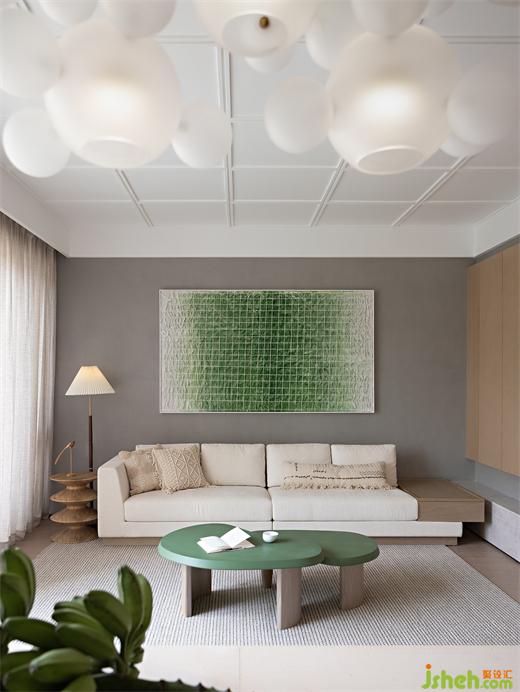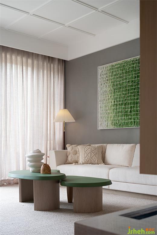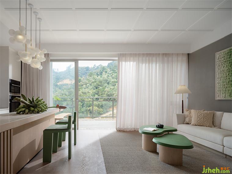 融創(chuàng)樣板房設(shè)計(jì)打造有機(jī)自然主義家居氛圍客廳清新的綠色色調(diào),與自然同頻