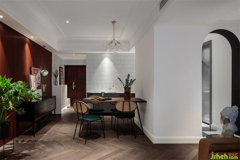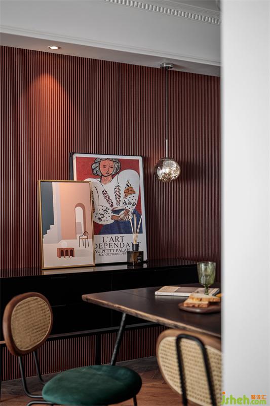 推門入眼,是耀眼的磚紅色,熱烈而朝氣蓬勃。墻面的紅色波浪板在能夠增加空間層次的同時(shí),也起到一定的過(guò)度作用,搭配墨綠色的竹編餐椅,在人字拼木地板的映襯下,復(fù)古而摩登。
