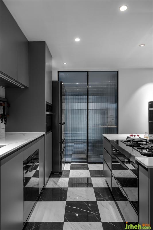 原廚房因?yàn)榭臻g獨(dú)立且形式單一,而導(dǎo)致空間具有局限性,設(shè)計師在考慮這些因素后決定打破常規(guī)。將廚房與生活陽臺之間墻面拆除,以極簡的玻璃隔斷一分為二,與餐廳形成一體設(shè)置成開放式廚房,最大程度的滿足廚房的功能需求,也離斷了原有的固定空間,讓整個空間變得自由寬闊,采光充足。黑白格子的瓷磚,增加空間的趣味性。