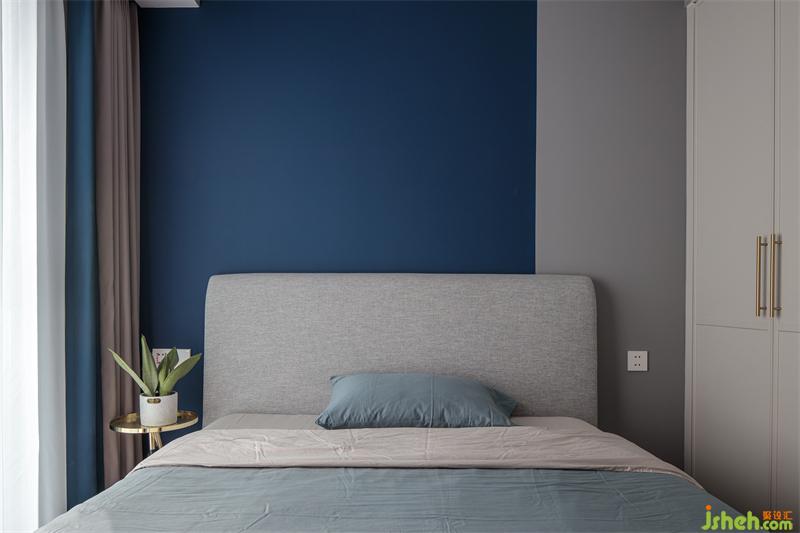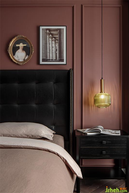 設(shè)計師基于對簡約空間的追求,色彩上,臥室選擇淺一點(diǎn)的豆沙紅與深黑色,局部點(diǎn)綴墨綠色,沿用了客廳一貫的撞色法,生動而有趣。