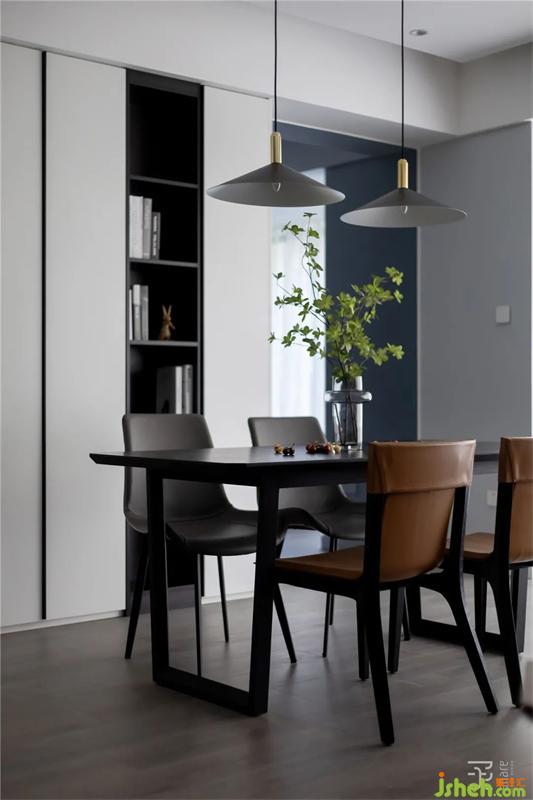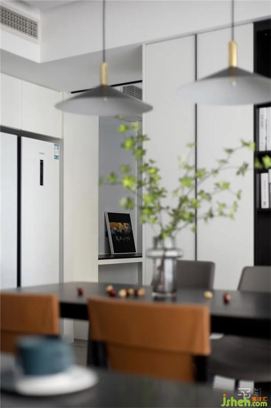 冰箱、書(shū)柜、餐桌,巧妙的融合在一個(gè)空間里,不僅省空間,也讓家人有更多的時(shí)間相處。沙發(fā)后的矮柜,既能儲(chǔ)物,又恰到好處的隔開(kāi)2個(gè)空間。整體與客廳相連,擴(kuò)大視野,但又是可以獨(dú)立操作空間。