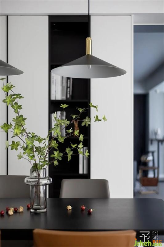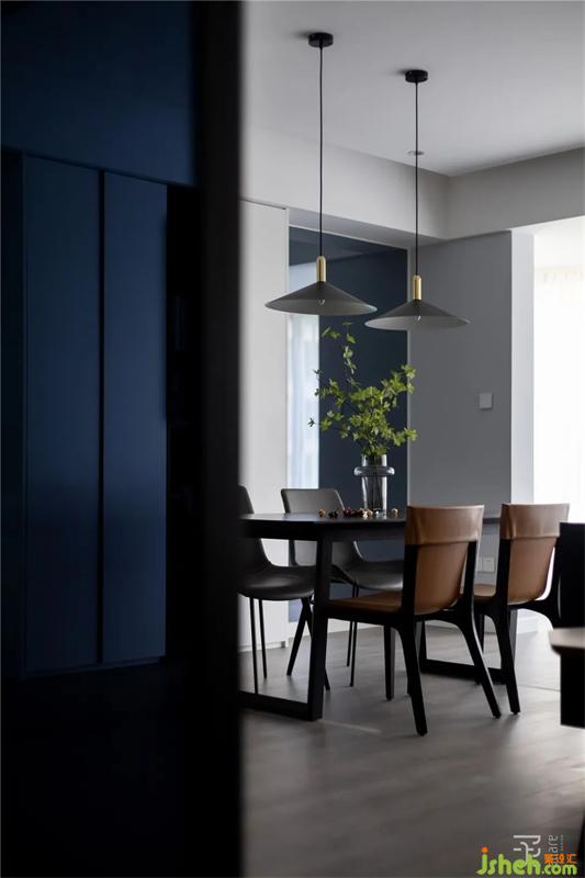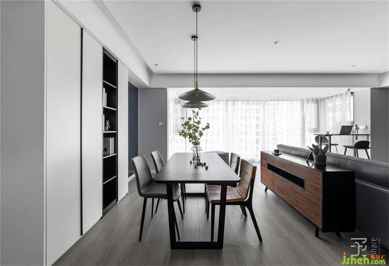 我們?nèi)∠筒蛷d之間原有推拉門(mén),客餐廳與陽(yáng)臺(tái)區(qū)域的分隔也被打開(kāi),讓原本較窄的陽(yáng)臺(tái)空間更好的融入客廳。同時(shí)把陽(yáng)臺(tái)封裝成幾面超大的落地玻璃,讓整個(gè)空間更為通透和寬敞,讓就餐空間不再單調(diào)。