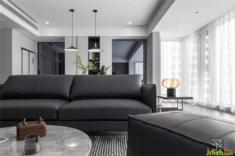 客廳打破了傳統(tǒng)格局,打通陽臺,在靠電視墻一處設(shè)計(jì)了小吧臺,讓屋主在這里簡單的辦公、喝茶、聊天等。陽臺放置一個慵懶的沙發(fā),在周末陽光灑進(jìn)來時可以看看書,或練練瑜伽。
