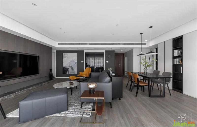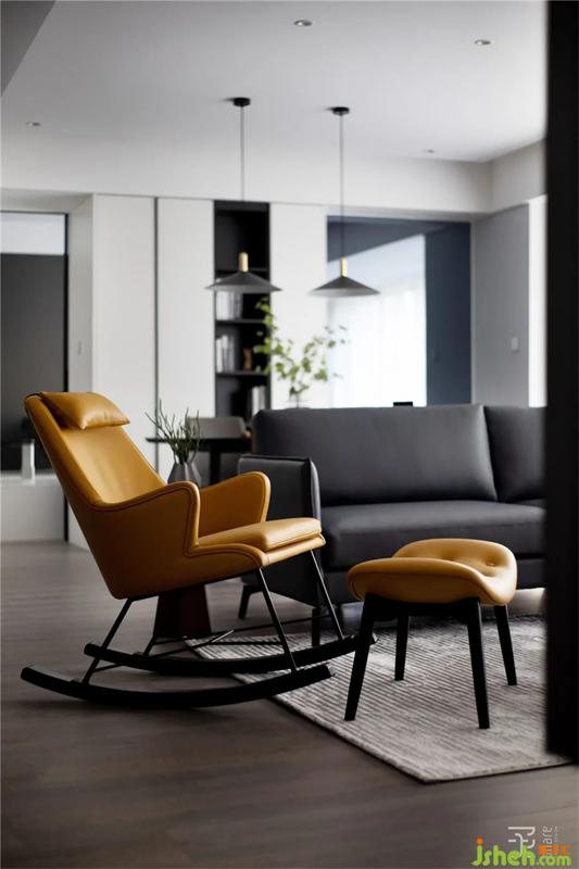 整體空間盡量簡單、干凈、質(zhì)感、舒適,簡單柔軟的深灰色皮沙發(fā)和姜黃色的單人位沙發(fā),讓活動空間自由而純粹。沒有過多的造型和復(fù)雜的裝飾,嵌入式的電視鑲嵌在背景墻中,連所有的電源線都被完美的收納在其中,看不到一絲雜亂。