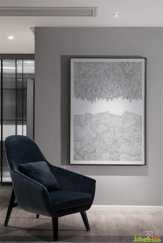 線描的裝飾畫勾勒出舒適的富有生命力的線條,搭配藍色的絨布單椅,使空間更富有魅力。