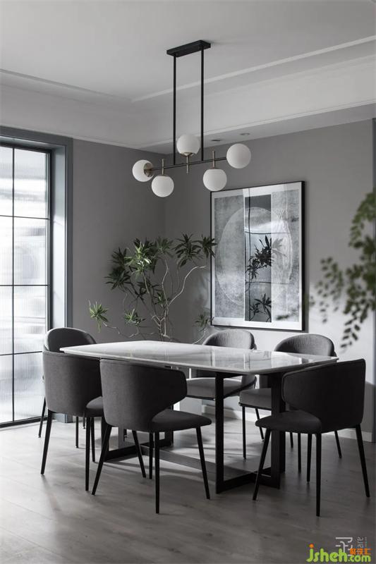 餐廳空間與西廚的一體化的設(shè)計,使得整個空間柔和的交融在一起,富有層次感的灰調(diào)中點綴著的淡淡的綠色,整個空間便活了起來。亮面的大理石餐桌臺面搭配布藝的餐椅及設(shè)計感的黑白裝飾畫,餐廳的高級感油然而出。
