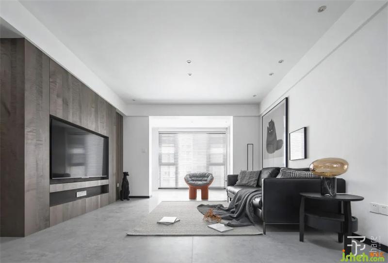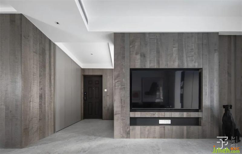 電視機(jī)背景墻摒棄了傳統(tǒng)電視機(jī)柜的擺放方式,采用嵌入式設(shè)計。大面積的暖灰色楓木水波KD板以純粹的色彩和木材肌理,賦予空間一份自然之氣,營造了一種天然的安定感。