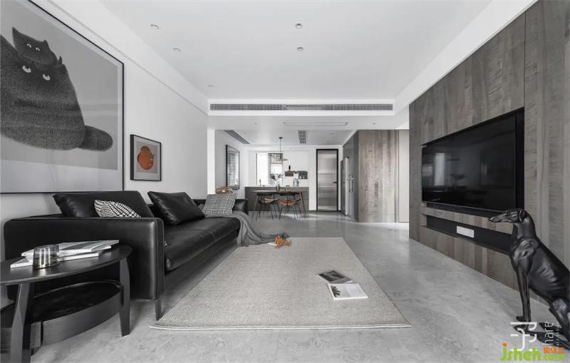 黑色皮質(zhì)沙發(fā)搭配深色邊幾,簡潔純粹,采用的無茶幾的設(shè)計方式,無形中放大了空間。