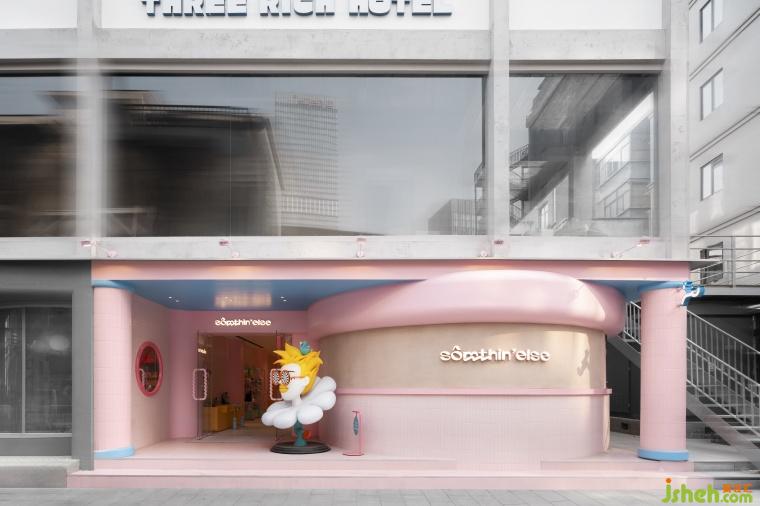 店鋪?zhàn)溆诮謪^(qū)的轉(zhuǎn)角位置,擁有雙面外立面設(shè)計,以最大化品牌的可見度與互動感。整體色調(diào)選用大膽且柔和的粉色,并融入弧形柔和曲線,呈現(xiàn)出類似充氣氣球般的輕盈感,仿佛漂浮在街區(qū)之中。這種視覺語言不僅回應(yīng)了潮宗街區(qū)的松弛氛圍,也讓品牌更具吸引力,激發(fā)行人的好奇心。